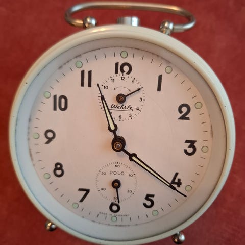 Vintage Saksassa valmistettu vedettävä herätyskello Wehrle Fanta Duplex. Toimiva kaikin puolin. Ostettu muinoin kelloliikkeestä, liikkeen tarra pohjassa (Kelloliike Into Virman, Salo). Hinta 63 e / tarjous.