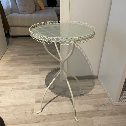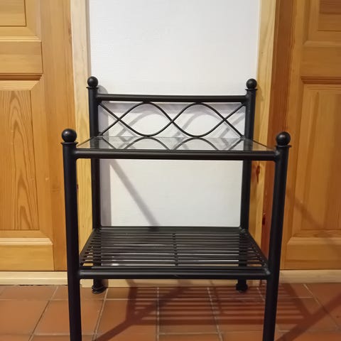 Lasikantinen yöpöytä mustalla metalli rungolla. Lasi nostettavissa irti. Ehjä. Vain nouto.