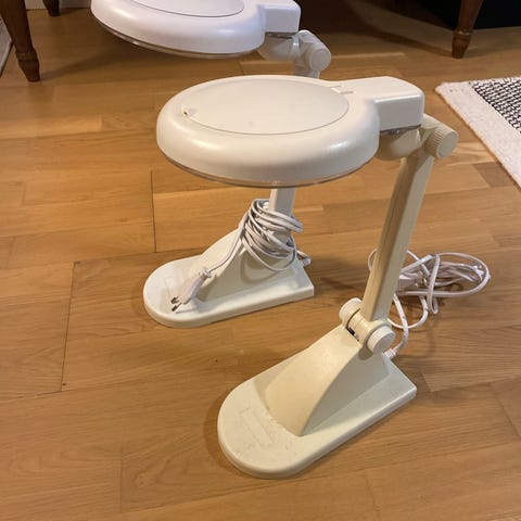 Luxo LM-2 pöytävalaisin, jossa on suurennuslasi. Toimii. Pöytäkiinnike tulee mukaan.