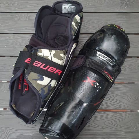 Käytetyt Bauer Vapor 3X Pro-polvisuojat. Toisessa suojuksessa pieni halkeama (hinnasta voi neuvotella)