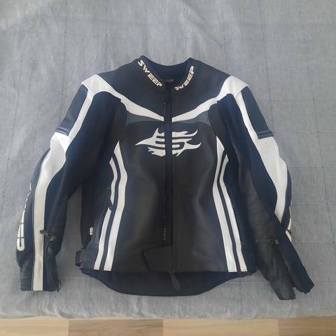 Hyväkuntoinen Sweepin nahkatakki, housujen kiinnitys vetoketjulla mahdollinen.