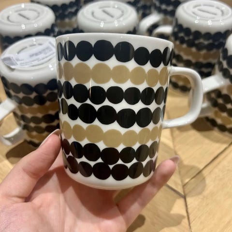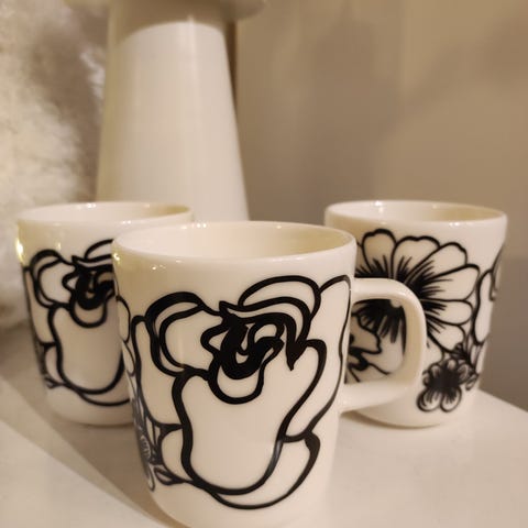 Uudet, täysin käyttämättömät Marimekko Oiva ’OKKO’ glögimuki ja lusikka. Olleet koristeena hyllyllä.