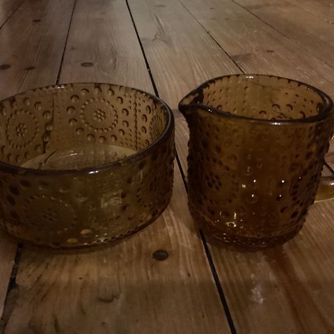 Tarjolla upea pari klassista suomalaista lasimuotoilua: Nanny Stillin suunnittelemat Riihimäen Lasin Grapponia-sokerikko ja -kermakko!