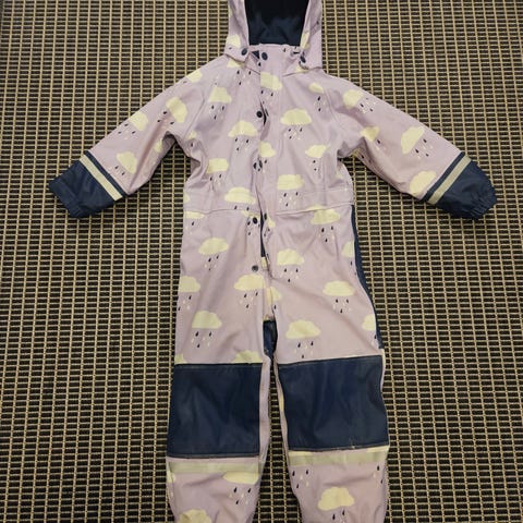 Lilan/keltainen Safe Haalari, huppu, jossa nauhat, edessä vetoketju, tarrat, kumi lenksut puntin suissa, ehjät.