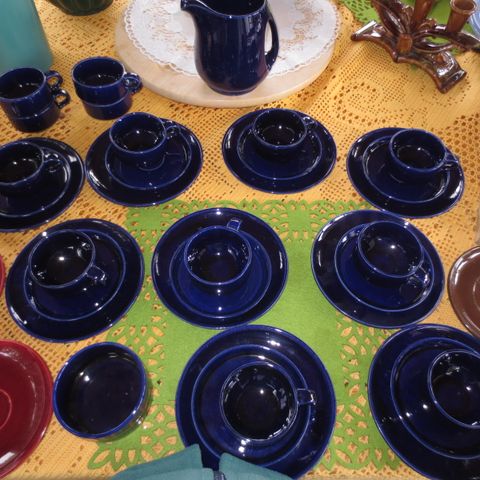 Kupittaan Saven Teekalusto 10 kpl Kuppeja - 10 Tassia - 11 Pullalautasia - Iso Vati - Sokerikko - Kermakko, kermakosta pala pois, Signeerattu LN