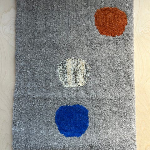 Villasta tuftaamalla tehty seinävaate.Takana lenkit ripustusta varten.