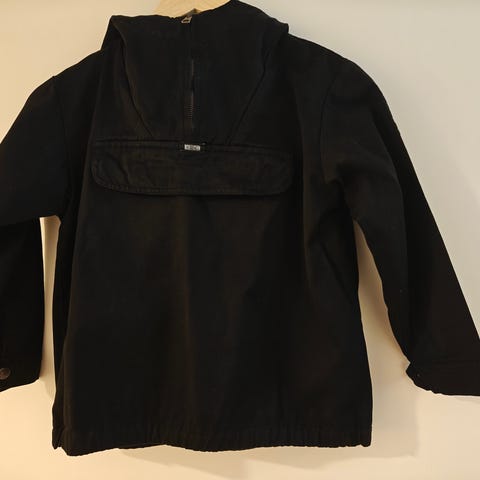 Edessä läpän alla tasku. Helmassa ja hupussa kiristysnyörit.