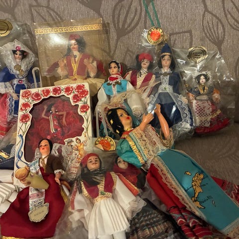 Vanhoja nukkeja 8 kpl pääasiassa kansallispuvuissa, matkamuistoja/tuliaisia maailmalta. Vanhalla nukella ilman muovikoteloa on avautuvat silmät. Kaikki nuket yli 30 vuotta vanhoja, osa paljon vanhempiakin. Myyn kaikki kerralla.