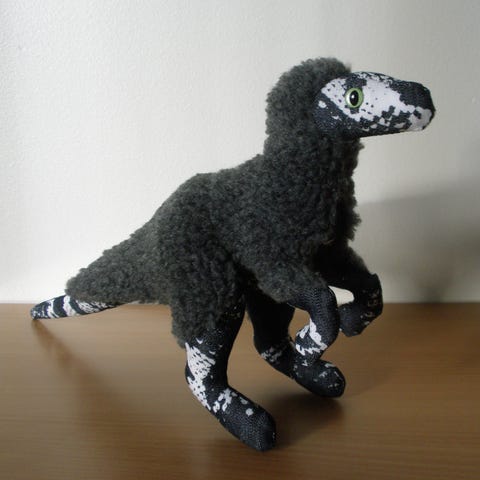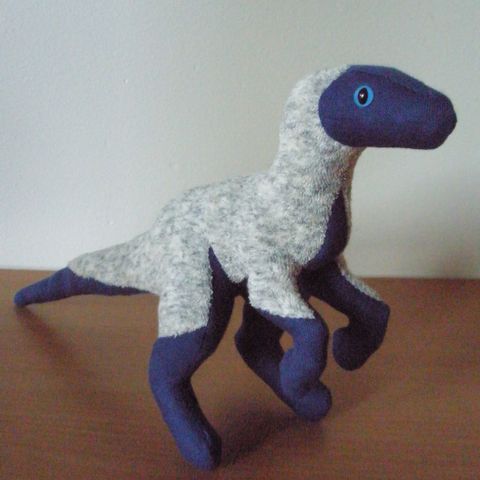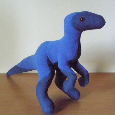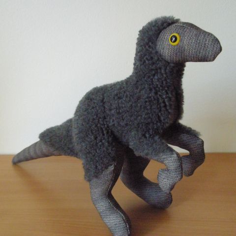 Käsintehty dinosaurus raptori pehmolelu.