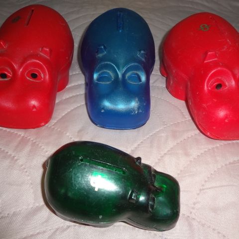 Molemmat säästölippaat ehjät ja hyväkuntoiset. Pientä kulumaa kun tarkasti läheltä katsoo. Avainta ei.