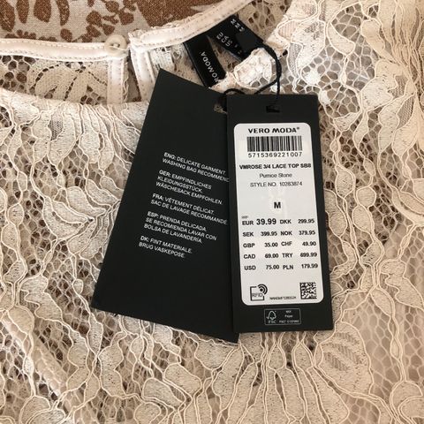 Niskassa napitus. Ei irroitettava pitsikoriste jossa helmiä. Materiaali (100% polyester) ei jousta.