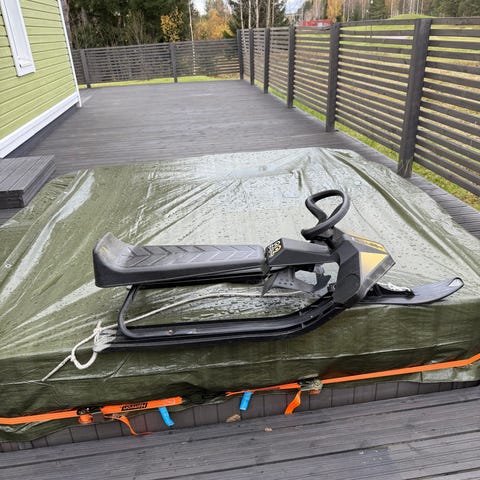 Myydään tämä nyt kesällä ja uusi lumi leikkeihin talveksi John Deere kelkka mahtuu 2 laskijaa kyytiin ja vetonaru.Menee hyvin varastoon kasattava malli.Mukava laskea.