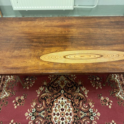 Muuten hyväkuntoinen, mutta kannen lakkaus on kärsinyt vuosien aikana. Tarkoituksena oli hioa ja lakata pöytä, mutta muuton myötä sohvapöydälle ei ole enää tarvetta uudessa kodissa, joten siksi myyn.