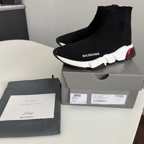 Balenciagan mustat Speed kengät koossa 37. Toisessa kengässä pieni reikä ihan varren yläosassa, mutta kangasta saa venyttää kunnolla, että se näkyy.