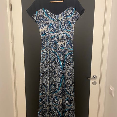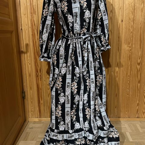 Joustavaa kangasta oleva maximekko, menee koossa XS-M. Vyötäröllä nyöri, jolla mekkoon saa muotoa. Helma suora, jossa kuminauharypytys toisella puolella.