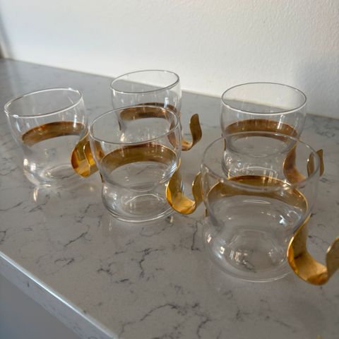 6kpl Iittalan Paula-laseja ja 5kpl lautasia, värinä kulta (Jorma Vennola). Lasin korkeus n. 11cm ja suun halkaisija 6.5cm (isoja laseja). Lautasen halkaisija n. 13,5cm. Lasit todella hyvässä kunnossa, mutta lautasissa hieman käytön jälkiä (hyvin pieniä kulumanaarmuja hieman). Yksi lautanen puuttuu, siksi eriparimäärä. Ostaja maksaa postikulut ja noutaakin voi Tampereelta.