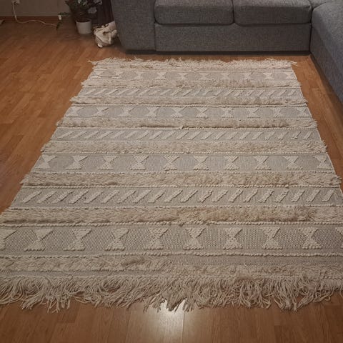 Tekisin tilaustyönä kuvan juhannusruusumattoja. Kuvan matto on halkaisijaltaan 135 cm. Virkattu ontelokuteesta (80% puuvillaa). Mattoon meni n. 3.8 kg kudetta (12.90 e/kg), plus teko palkka. Ohje 110 cm matolle. Koon, värin ja kuteen voit valita itse.