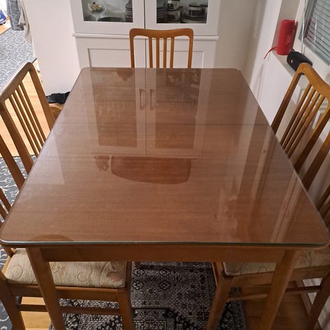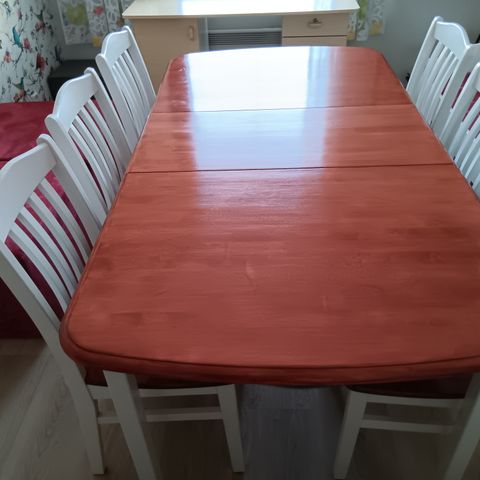 N. 100 vuotta vanha tamminen pöytäryhmä tarpeettomana muuton tieltä. Pehmusteissa hieman kulumaa. Lisätietoja kysymällä.