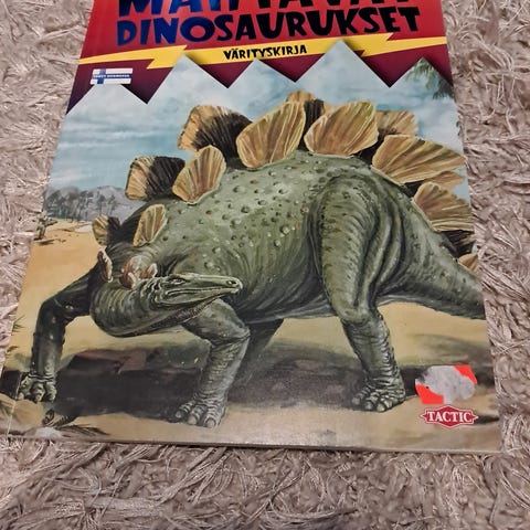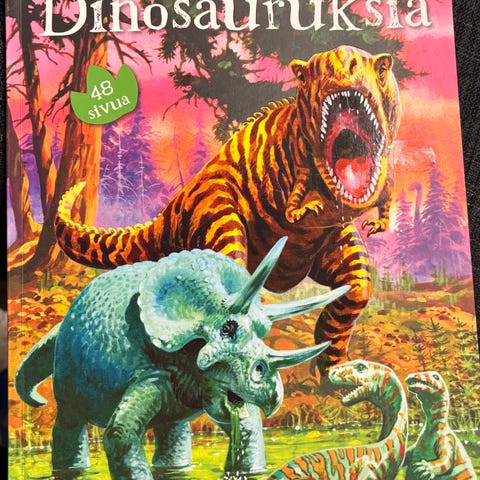 Värityskirja, jossa pelkällä vedellä maalaamalla saa dinosaurusaiheisia vesivärimaalauksia. Mukana sivellin, joka uudenveroinen. Kaksi ensimmäistä kuvaa maalattu ja irrotettu, loput koskemattomia.