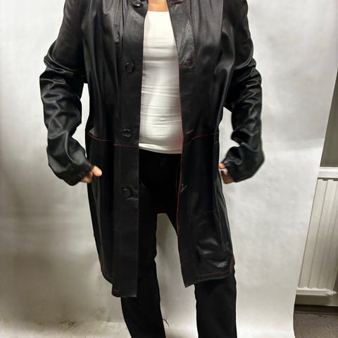 Punainen Suomessa valmistettu vintage pitkä mokkanahkatakki, merkki Friittala. Takki on uudenveroisessa kunnossa! Todellinen katseenkääntäjä!
