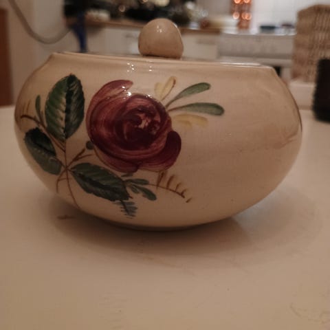 Erittäin hyvässä kunnossa oleva käsinmaalattu kannellinen ruusupurkki. Nouto
