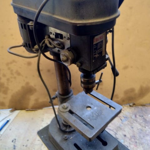 Ok.kuntoinen pöytäpora,vaihteet ja puristin työkappaleille. Säädettävä.