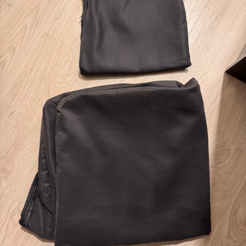 Sini-valko-raidalliset 3-istuttavan sohvan päälliset. Lisäksi kaksi tyynynpäällistä ja käsinojapäällise, eli koko setti. Todella hyvässä kunnossa. Todella kauniit ja kestävät. Kuosi siinä mielessä spesiaali, ettei taida saada enää mistään.