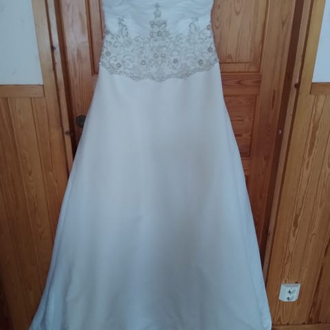 Eurobriden kaunis luonnonvalkoinen kirjailtu hääpuku. Hääpuvussa pitkä laahus jonka voi myös kiinnittää ylös. Olkaimeton vaikkakin puvun sisällä napit, joihin mahdollista olkaimet kiinnittää. Niitä ei tule mukana.