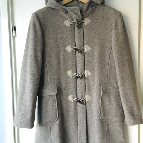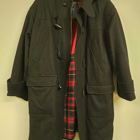 Erittäin hyväkuntoinen duffelitakki kokoa 38, musta siisti villakangas, 80% villa 20% polyamidia.