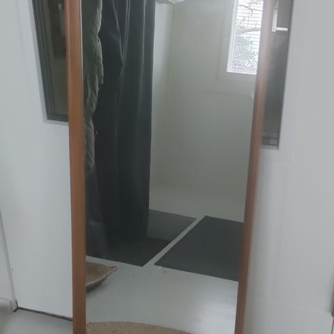 Näyttelypeilinä ollut upea Saana-tunturi-aiheinen, ovaalin muotoinen peili, valkoinen puukehys. Koko 47x57 cm. Hieman kolhua maalipinnassa.