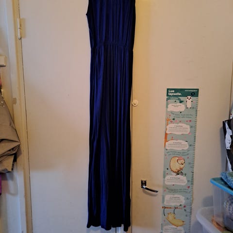 Ihana tummansininen maximekko, jossa kaunis kirjailu rinnassa. Selässä vetoketju. Kangas on kevyttä ilmavaa 100% viskoosia. Ostettu Etelä-Afrikkalaisesta muotiliikkeestä. Mukaan saa mekkoon alunperinkin kuuluneen hapsuvyön, jossa nyppyjä (näkyy kuvassa). Koko S. Hinta 7€.