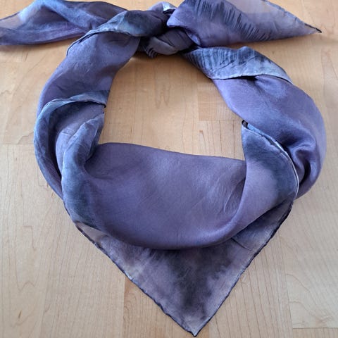 Ei materiaalimerkintää, mutta tuntuu silkiltä. Käsin rullatut reunat.