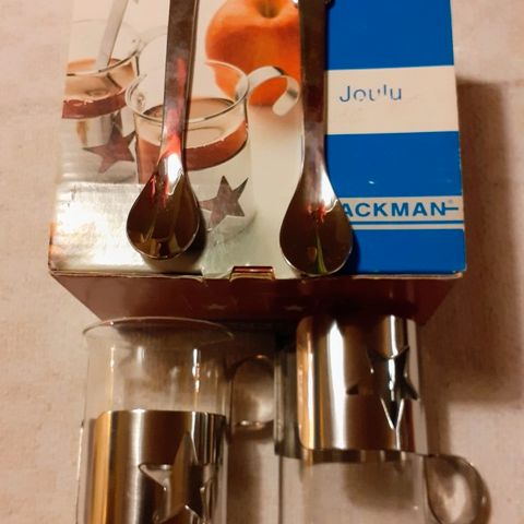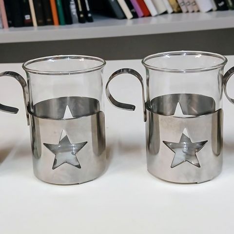 Hackman, Magnus Lundström, Joulu-sarjan tähtikuvioiset lasimukit teräspidikkeellä 6kpl, mittoja korkeus n.7cm vetoisuus n.12cl + kaksi myyntipakkausta