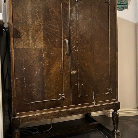 Siistissä kunnossa oleva kaappi kauniilla hillityillä yksityiskohdissa. Yläkoristeen voi ottaa pois niin halutessaan.