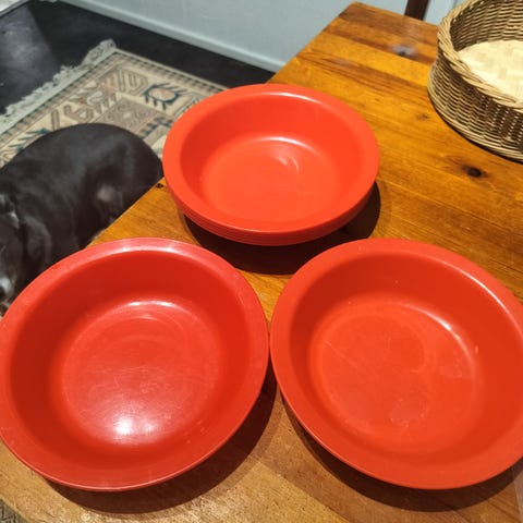 3x syvää muovilautasia, 7x muovimukia ja 2x juomalasia (toinen Ikean). Voi kysyä tiettyä astiaa myös erikseen.