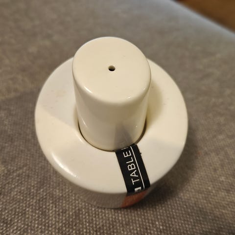 Kolme posliinista sirotinta, joissa on muovitapit pohjissa täyttöä varten. Pinnassa näkyy iän jättämiä jälkiä, mutta ovat täysin ehjiä.