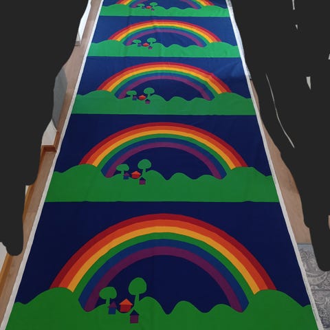 Hyväkuntoinen kangas. Värit pitäneet hyvin, valkoinen ei ehkä alunperinkään ole ollut vitivalkoinen. Pesty, silitystä vaille.