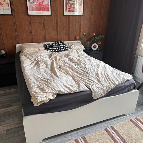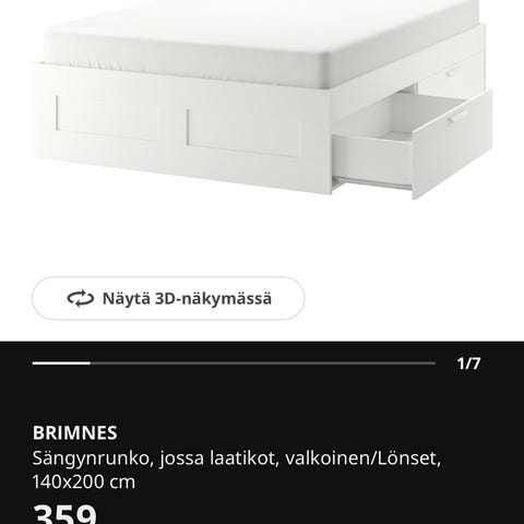 Sängynrunko, jossa on neljä tilavaa laatikkoa. Valkoinen, 160x200 cm. Myynnissä uutena 279 euroa.