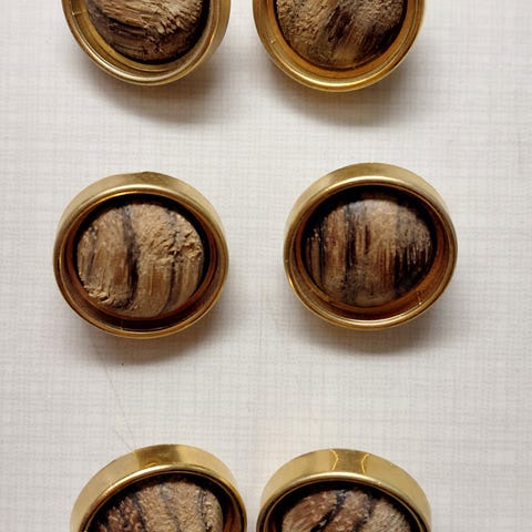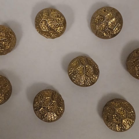 Upeat lehtimessingillä päällystetyt vintagenapit. 4 isompaa ja 2 pienempää. Napit ovat suht painavat, jotain komposiittimassaa mihin upotettu metalliset kiinnityslenkit. Pinnassa on sisäkäyttöön sopiva suojalakka, jos laitat ulkovaatteeseen, lisää sopiva vedenkestävä lakka. Kaupanpäälle 90-luvun kaunis tuotemerkki, langat irtoilleet takaa, pesty.