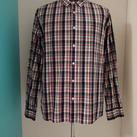 Kuvan vähälle käytölle jäänyt miesten kauluspaita. Hamptons Republic-merkkinen, kauluksen koko 41/42. Ruudullinen sinivalkoinen kuosi.