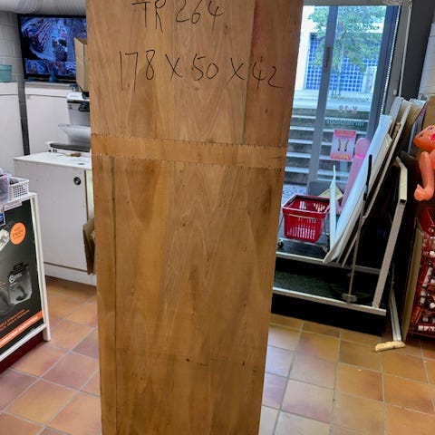 Yksi kulma hajonnut, mutta puuttuva kappale löytyy ja on liimattavissa. On periaatteessa uusi, koska ei ole ollut käytössä koskaan, mutta on varastoinnissa kärsinyt mainitut pikku viat. Ei ole kostunut tai turvonnut.