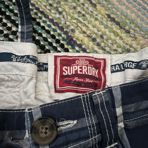 Myytävänä uudet ja käyttämättömät reisitaskulliset Superdry Cargo shortsit.