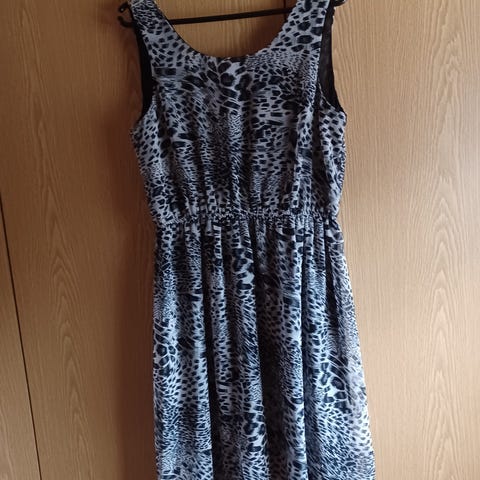 *Musta-valkoinen, hyväkuntoinen, täyspitkä, hihaton mekko.