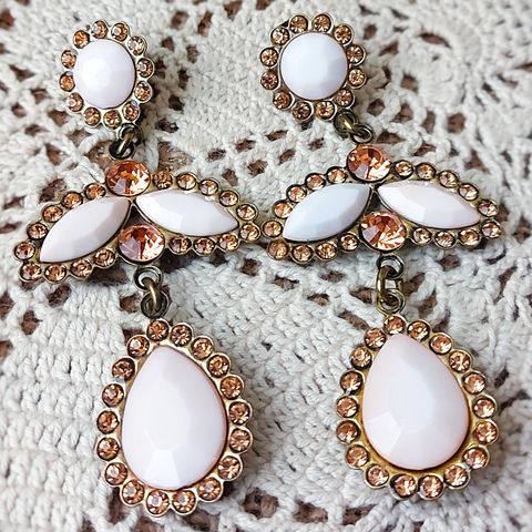 Uniikit korvakorut messinginvärisellä pinnalla, koristeltu emalilla ja pienillä strasseilla. Emaloinnin levitystapa - CLOISONNE. Tyylikkäät, sopivat arkeen ja juhlaan. Pituus noin 4 cm. Kunto erinomainen.