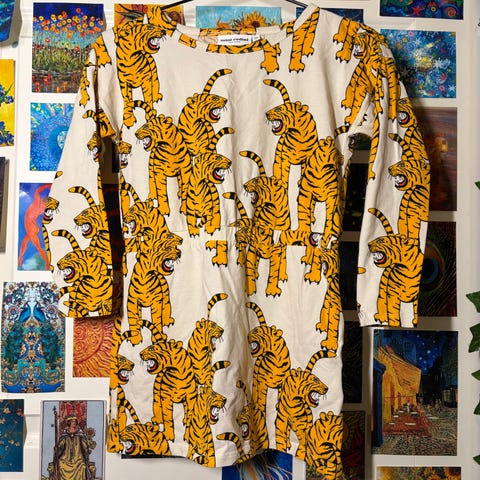 Mini Rodinin mäyräkoira kuosinen ihana mekko kokoa 128cm/134cm, vastaa mielestäni kokoa 128cm. Ehjä muuten, mutta pistereikä kokolapun vieressä (parilla pistolla parsittava, en ole tehnyt kun huomasin vasta kuvatessa), ja kaksi pientä tahraa helmassa alhaalla sivussa ja yksi hihassa, kts.lisäkuvat. Yleisilme siisti käytetty.
