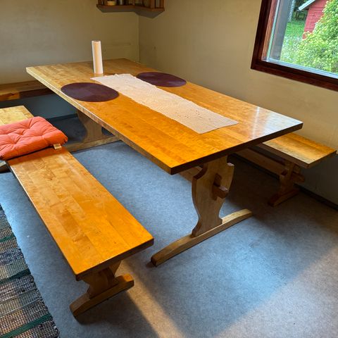 Ilmari Tapiovaaran suunnittelema pirttikalusto Hongisto. Pöytä ja 2 pitkää penkkiä vuodelta 1966.