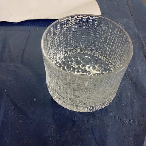 Lasin reunasta lohjennut niin pieni pala, että oli vaikea saada siitä kuvaa... Postitettuna 5e + postikulut.