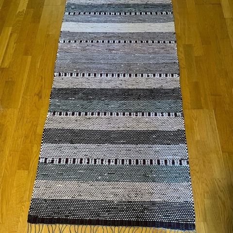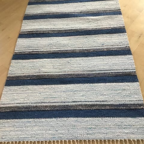 Myydään uusi raidallinen sini-musta-harmaa räsymatto, tehty puuvilla kuteista, kalalankaloimeilla. Pituus 202cm, leveys 76cm. Kissatalous, mutta matto on rullattu komerossa. Nouto.