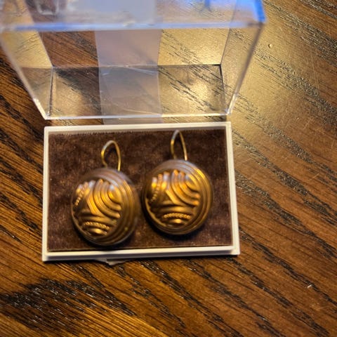 Korvikset ovat hyvässä kunnossa, toki vähän patinoituneet ajan myötä, mutta kuvissa näkyvää mistä lie kuvaan tullutta mustaa viirua ei niissä oikeasti ole.