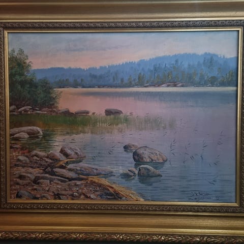 Öljyvärimaalauksen koko on 67 cm x 70 cm. Taulun nimi on "Rantakivet", ja sen on maalannut Eira Judin. Maalaus on kehystetty ja siinä on ripustuslanka. Se on vuodelta 2020.